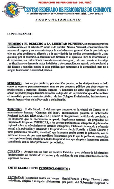 Chimbote en Línea.- Tras la irresponsable y reprobable conducta asumida por el gobernador regional de Áncash, Waldo Ríos Salcedo, quien no tuvo reparos en enfrentar a la población del asentamiento humano Caminos del Inca, en Casma, contra los periodistas del lugar, el Centro Federado de Periodistas de Chimbote rechazó este hecho.