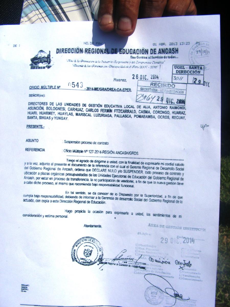 Según el dirigente el día 29 de diciembre llegó el oficio múltiple Nº 543, donde se ordena se declare nulo todo proceso de contrato y ubicación a plazas orgánicas del sector. Por lo que quedaría invalidado el concurso realizado por la UGEL.- Santa, a través de la que se pretendía cubrir 27 plazas administrativas.