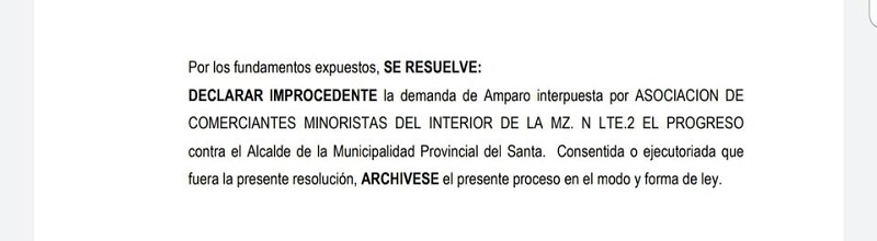 Chimbote en Línea.- El Cuarto Juzgado de Civil de la Corte Superior de Justicia del Santa, declaró improcedente la demanda de Acción de Amparo interpuesta por la Asociación de Comerciantes del mercado El Progreso en contra de la Municipalidad Provincial del Santa (MPS), contra el proceso de desalojo y demolición.