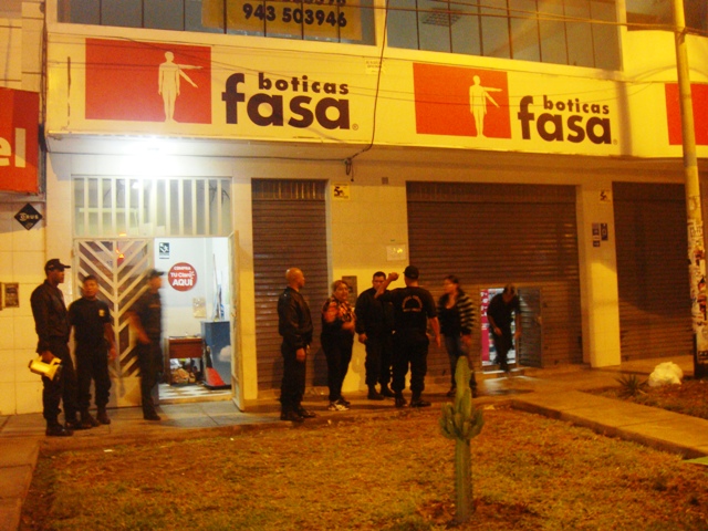 movimiento extraño de dos sujetos en el frontis de Fasa. Al acercarse descubrieron que eran delincuentes.Durante la intervención advirtieron también que al interior del local de Boticas Fasa había ladrones. Habían ingresado a través de un forado que realizaron por una vivienda contigua a la farmacia.