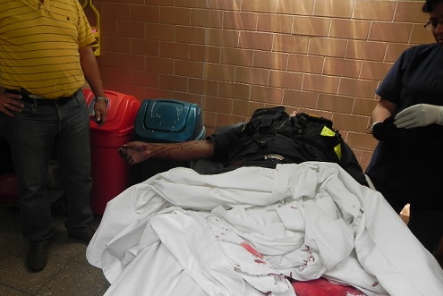 “El policía había salido de una juguería, cruzó la pista y fue a comprar medicinas. De regreso, cuando caminaba por la pista fue atacado por la espalda, forcejeó con el drogadicto, pero asesinato-policia-carreteras-drogadicto1este logró quitarle su revólver que llevaba en su cinto. Primero le disparó en la cabeza y después lo remató, cuando gritamos este hombre enloquecido apuntó con el arma de fuego a todos lados, entonces tuvimos que corrernos”, contó una comerciante de nombre Paula Regalado Castañeda.