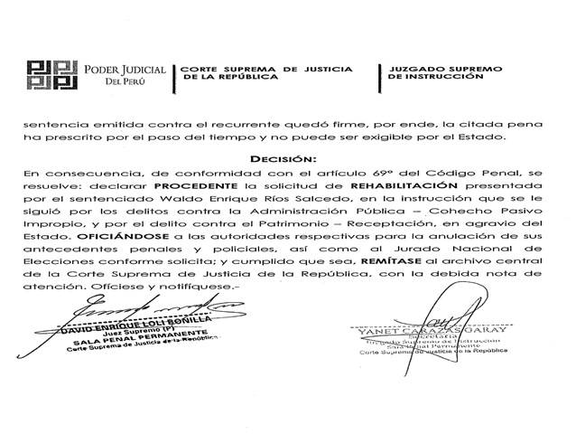 La decisión del Juzgado Supremo de Instrucción de la Corte Suprema de Justicia, a cargo del magistrado supremo provisional David Enrique Loli Bonilla, se sustenta en que Ríos Salcedo cumplió la pena de cuatro años de prisión suspendida, además de cancelar la reparación civil de un millón de nuevos soles que se le impuso en forma solidaria con los demás sentenciados en el proceso por haber recibido dinero de manos de Vladimiro Montesinos.
