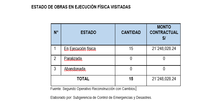 La Contraloría General identificó que solo se ha ejecutado el 25% del total de recursos aprobados para la ejecución de obras y servicios de construcción y reconstrucción en el marco de la Reconstrucción con Cambios, ascendente a S/ 4,277´081, 753 (setiembre 2017 a octubre de 2018),  según los resultados del Segundo Operativo “Vigilamos contigo la reconstrucción”, cuya finalidad fue conocer el estado situacional y avance económico-financiero de las intervenciones que se ejecutan en las 13 regiones afectadas por el fenómeno de El Niño Costero 2017, incluyendo Lima Metropolitana.