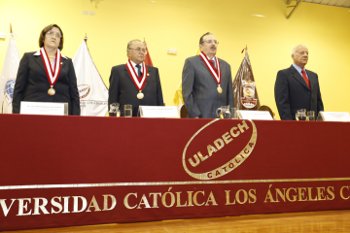 Chimbote en Línea.- Con un auditorio lleno de estudiantes, el Presidente del Consejo de Evaluación, Acreditación y Certificación de la Calidad de la Educación Superior Universitaria (CONEAU), Dr. Francisco Delgado de la Flor Badaracco, entregó las resoluciones de acreditación de las carreras profesionales de Obstetricia y Educación Inicial a la Universidad ULADECH Católica.