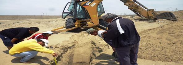 Como parte del proyecto de expansión urbana que realiza el Ministerio de Vivienda, Construcción y Saneamiento (MVCS) en el distrito de Nuevo Chimbote en coordinación con la municipalidad del sector, se realizan trabajos de calicata y excavación en pueblos aledaños a la Carretera Panamericana Norte (CPN) para determinar la profundidad de agua.(Texto y foto Cintia Cabrera)