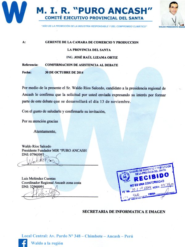 Chimbote en Línea.- Los candidatos a la presidencia regional de Áncash, Waldo Ríos Salcedo y Ricardo Narvéz, líderes y fundadores de los movimientos regionales Puro Áncash y Andemar, respectivamente, confirmaron formalmente (vía cartas) su participación en el debate electoral que organiza la Cámara de Comercio del Santa en alianza con Transparencia, Radio Programas del Perú, PNUD y Chimbote en Línea.