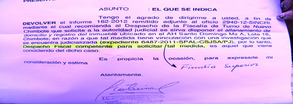 (Unidad de Investigación).-Enorme malestar ha causado en la Policía Nacional el "peloteo" que existió a nivel del Ministerio Público para que se solicite ante la autoridad judicial la orden de allanamiento del domicilio y registro del inmueble de un sujeto con orden de captura vigente por haber participado en el atentado al exconsejero regional Ezequiel Nolasco Campos y en el asesinato de su hijo Roberto Torres Blas, ocurrido la noche del 20 de julio del 2010.