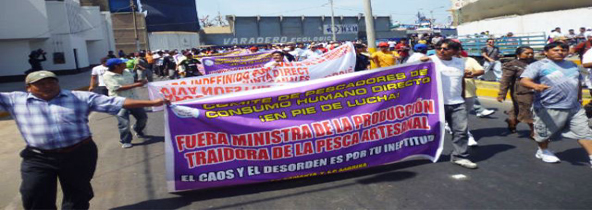 En su tercer día de huelga centenares de pescadores artesanales de las 150 embarcaciones de menor escala de Chimbote con arengas y quemando llantas continuaron en su protesta, exigiendo la derogación del D.S. 005-2012 que modifica el reglamento de pesca de anchoveta para el consumo humano directo. Asimismo pedían la destitución de la ministra de la Producción, Gladys Triveño, por atentar contra este sector productivo. (Texto y foto Milton Palpa)