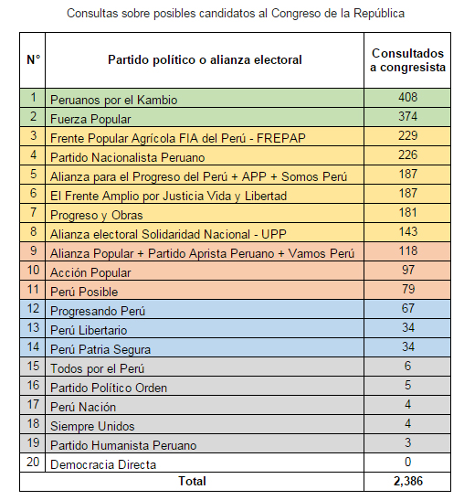 Lamentablemente los partidos políticos en contienda han hecho escasas consultas a la Ventanilla Única; entre ellos Todos por el Perú (6), Orden (5), Perú Nación (4), Siempre Unidos (4), y Partido Humanista Peruano (3). El partido Democracia Directa no efectuó ninguna consulta.