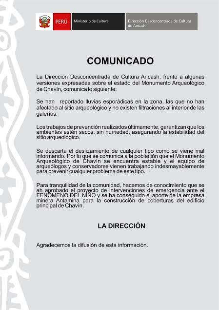 Para tranquilidad de la comunidad, la Dirección de Cultura hace de conocimiento que se ha aprobado el proyecto de intervenciones de emergencia ante el fenómeno El Niño y se ha conseguido el aporte de la empresa minera Antamina para la construcción de coberturas del edificio principal de Chavín. (Huaraz en Línea)