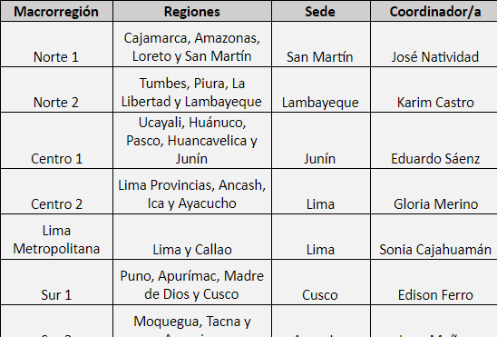 Las macrorregiones, las regiones y los coordinadores que componen los equipos son: