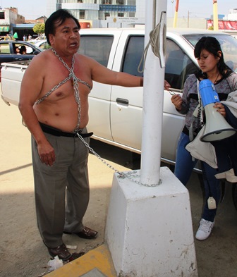 Chimbote en Línea (Judicial).-El exconsejero regional Ezequiel Nolasco Campos volvió a encadenarse esta tarde en el frontis de la Corte Superior de Justicia del Santa como un acto de protesta contra los magistrados que vienen dilatando increíblemente su caso y lo peor de todo es que estuvieron a punto de mandarlos a sus casas a los criminales que atentaron contra su vida y mataron a su hijo Roberto Torres Blas.
