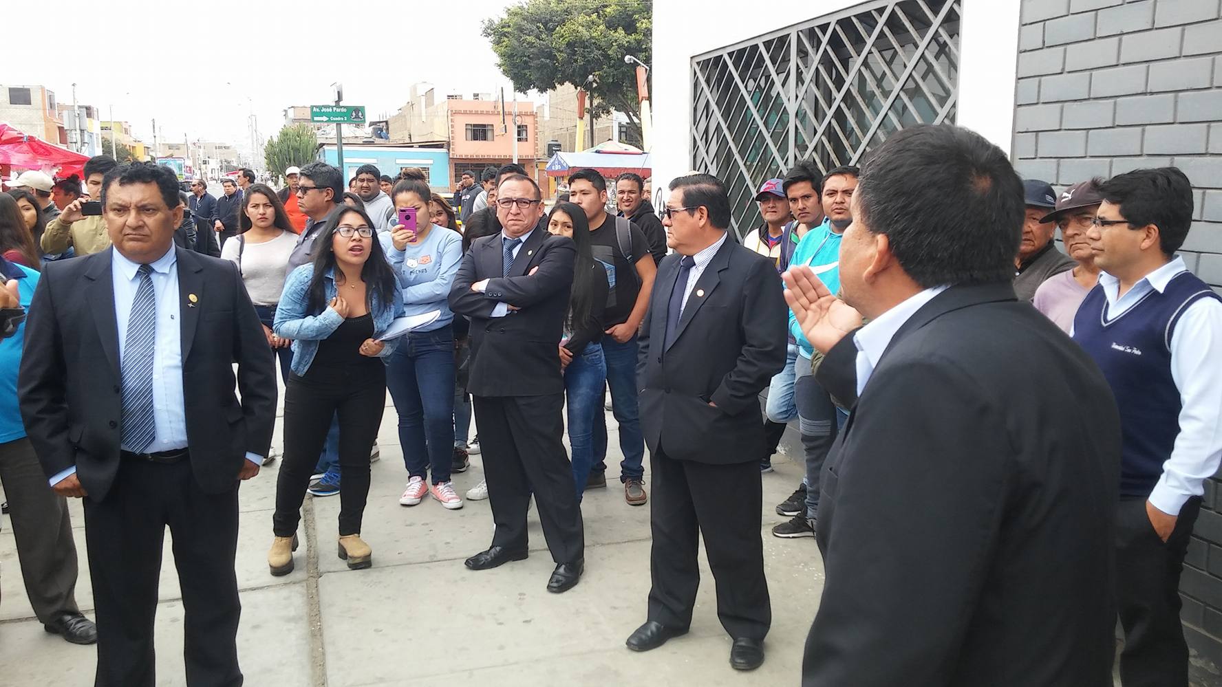 Hay dos grupos de manifestantes en los exteriores, uno respalda a Huamán Ruíz y otros se oponen y exigen su salida. Quien llegó al promediar la 1 de la tarde fue la congresista María Elena Foronda, quien ingresó al edificio para verificar lo que venía ocurriendo.