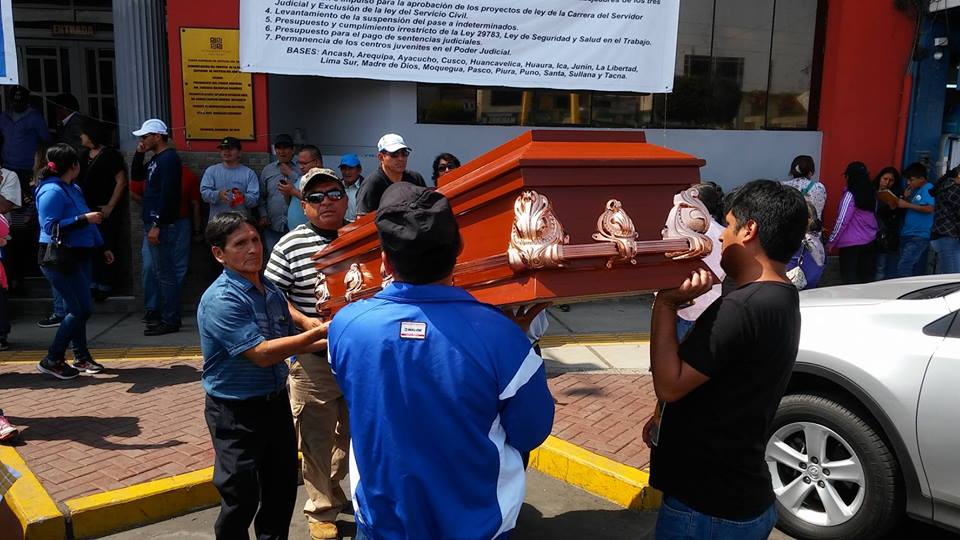 Desde muy temprano, los manifestantes se apostaron en los exteriores del palacio judicial y colocaron un féretro que luego fue paseado por las principales calles de Chimbote. Ellos simularon el velorio del presidente de la República, Pedro Pablo Kuczynski, del Ministro de Economía y Finanzas y de los congresistas, quienes no aceptaron el presupuesto solicitado de 3 mil 106 mil millones de soles para el Poder Judicial.
