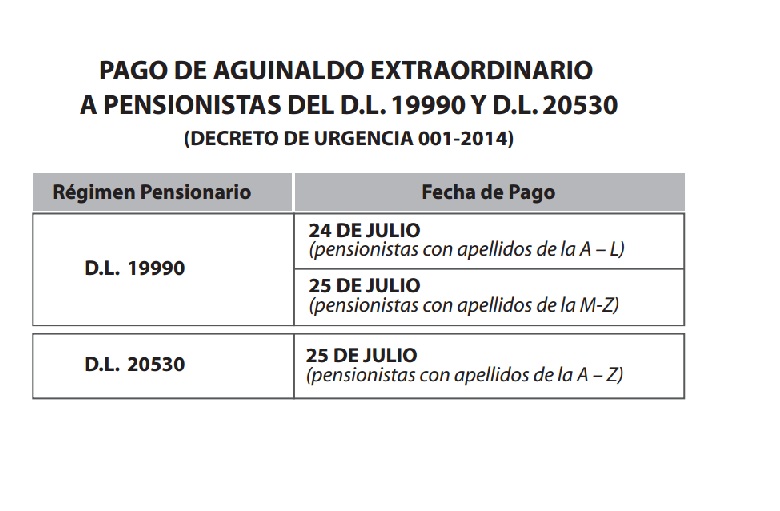 Mañana, jueves 24 de julio, la institución realizará el depósito del aguinaldo a sus administrados con apellidos de la "A" a la "L"; mientras que el viernes 25 cobrarán los pensionistas con apellidos de la "M" a la "Z". Igualmente, los administrados del D.L. N° 20530, a cargo de la ONP, recibirán sus pagos el viernes 25 de julio.