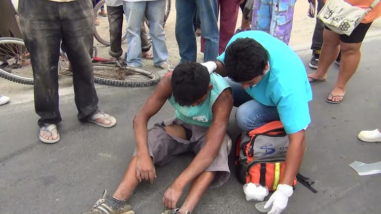 El primer accidente ocurrió entre una mototaxi y un ciclista que se registró a las 12:30 del mediodía de ayer en la avenida. Prolongación Pacifico a la altura del mercado Los Olivos, en circunstancias en que la mototaxi conducida por Elkin Corpus Carbajal embistió al joven Franklin Aponte Eche (17) cuando este