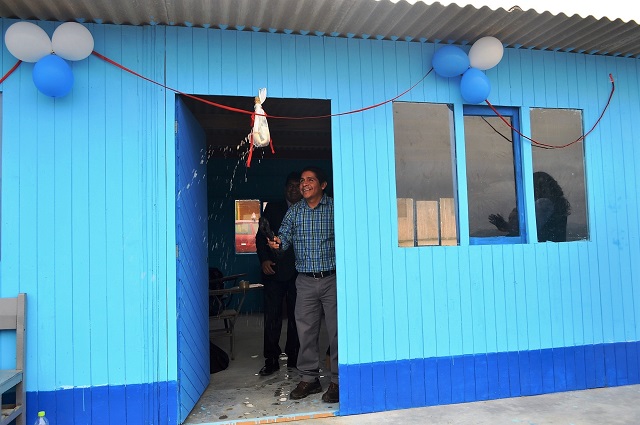 El director de la UGEL Santa, Robert Iturria Huamán, y Walter Soto Campos, apadrinaron las dos aulas prefabricadas en este plantel que en menos de un año de funcionamiento ya cuenta con más de 150 estudiantes de primaria y secundaria.