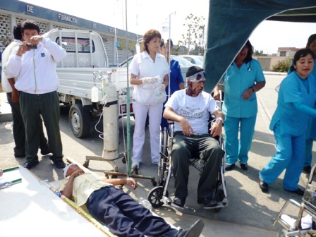 “Todo ha colapsado en la parte interna y ha sido necesario atender en carpas. Nos han faltado colchonetas, sillas de ruedas que estamos tratando de implementar. Por encima de los 30 pacientes en emergencia es mucho más difícil para cualquier hospital de Chimbote, atenderlas. Si llega mucha gente que requiere atención especial, es posible que los servicios colapsen”, informó el director del hospital regional Javier Vega Carrión, quien participó en el simulacro del sismo de 8.5 grados en la Escala de Ritcher.
