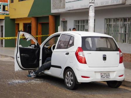 Chimbote en Línea(Policiales).- ¿Ajuste de cuentas?Un sangriento crimen se registró esta madrugada en pleno centro de Chimbote. Un taxista de nombre Jaime Vásquez Muñoz de 40 años “Jota” fue asesinado de cinco balazos en la cabeza al interior del vehículo Hyundai de placa de rodaje H1J-027, que alquilaba para trabajar en las noches.