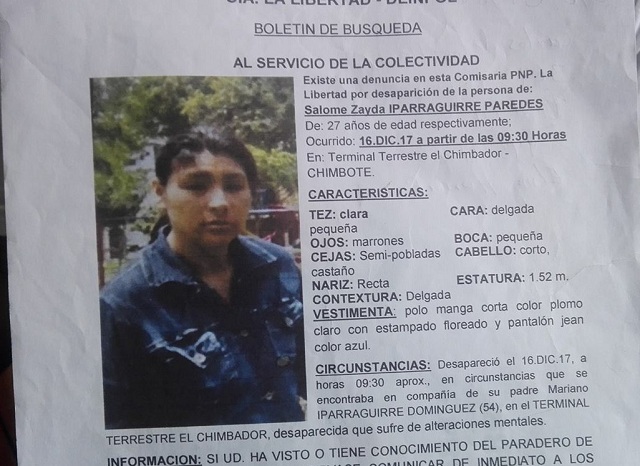 Chimbote en Línea.- Don Mariano Iparraguirre Domínguez de 54 años denunció la desaparición de su hija Salomé Zaida Iparraguirre Paredes de 27, que sufre de retardo mental y principios de esquizofrenia.