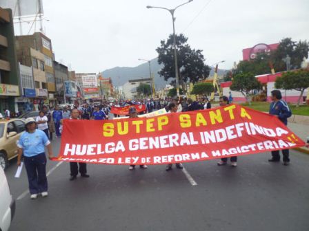 En su recorrido los docentes afiliados al Sindicato Único de Trabajadores de la Educación (SUTE) Santa llegaron hasta la Dirección Regional de Trabajo (Diretra) y la Unidad de Gestión Educativa local (Ugel) Santa, para dar a conocer sus pedidos entre ellos el rechazo de la Ley de Reforma Magisterial, el pago por luto y sepelio, la capacitación continua de los docentes y el pago del 30% por preparación y evaluación de clases.