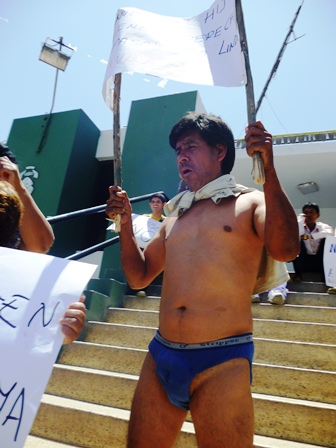 Es así que carteles en mano, los servidores de diferentes áreas de la Municipalidad prácticamente tomaron el frontis de esta institución. Incluso uno de ellos se desnudó en señal de protesta.