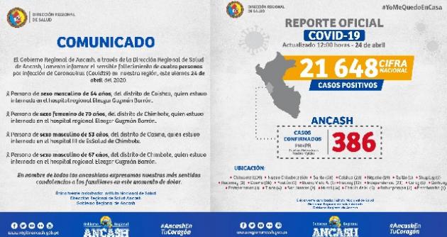 Asimismo, a través de un comunicado oficial se dio cuenta de 386 casos confirmados de Covid-19, siendo Chimbote el distrito con mayor número de pacientes con 109, seguido de Nuevo Chimbote 63, Santa 58, Coishco 23, Independencia 23, Huaraz 22, Nepeña 19 y Casma 18, entre otros. (Redacción Central)
