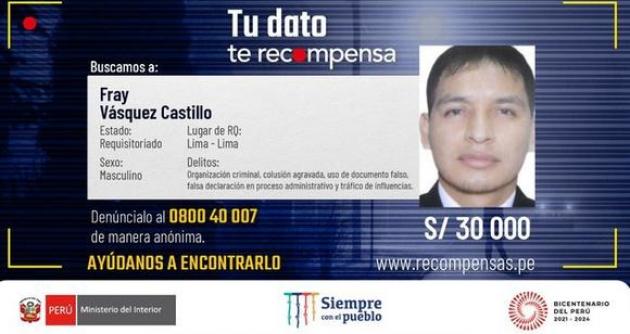 Chimbote en Línea.- El programa de recompensas del Ministerio del Interior informó que ha duplicado el monto que se ofrecía por información sobre el paradero de Fray Vásquez, sobrino del presidente Pedro Castillo, y que la suma actual asciende a los 30 mil soles.