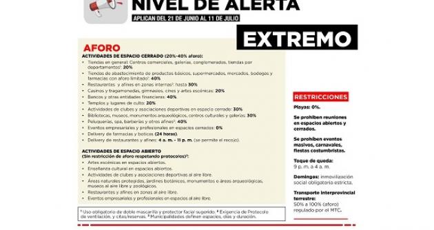 En este caso, no se puede acudir a la playa; se prohíben eventos masivos, carnavales, fiestas costumbristas; el toque de queda es de 21:00 a 04:00 horas; los domingos habrá inmovilización social obligatoria estricta; el aforo en el transporte interprovincial terrestre es de 50 % a 100 %.