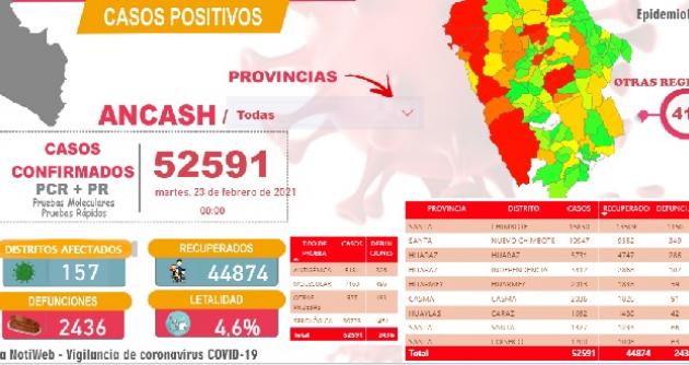 La Dirección Regional de Salud de Áncash (DIRESA) informó que la pandemia ha causa hasta hoy la muerte de 2 mil 436 personas en esta región, donde se han contagiado 52 mil 591, de los cuales 44 mil 874 vencieron al temible virus y la letalidad es de 4.6%.